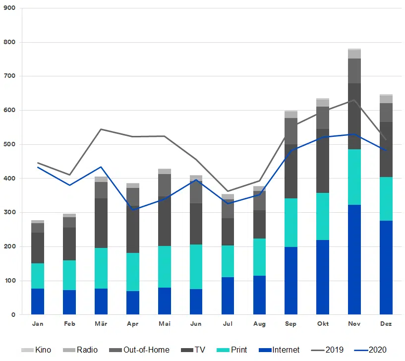 Die Werbetreibenden starteten etwas schüchtern ins Jahr. Aufgrund der geltenden Beschränkungen wie geschlossenen Kultur- und Freizeiteinrichtungen wollten die Marketingmassnahmen nicht richtig ins Rollen kommen. Nach ersten Öffnungen traute sich der Werbemarkt im zweiten Quartal dann aber wieder aus seiner Höhle. In der zweiten Jahreshälfte hatte sich der Werbedruck so weit erholt, dass er gegenüber den beiden Vorjahren sogar anstieg. Im Jahresabschluss lag der Werbedruck mit 5’598.4 Mio. CHF 12.3 Prozent höher als 2020 und nur 6 Prozent unter dem Wert von 2019.